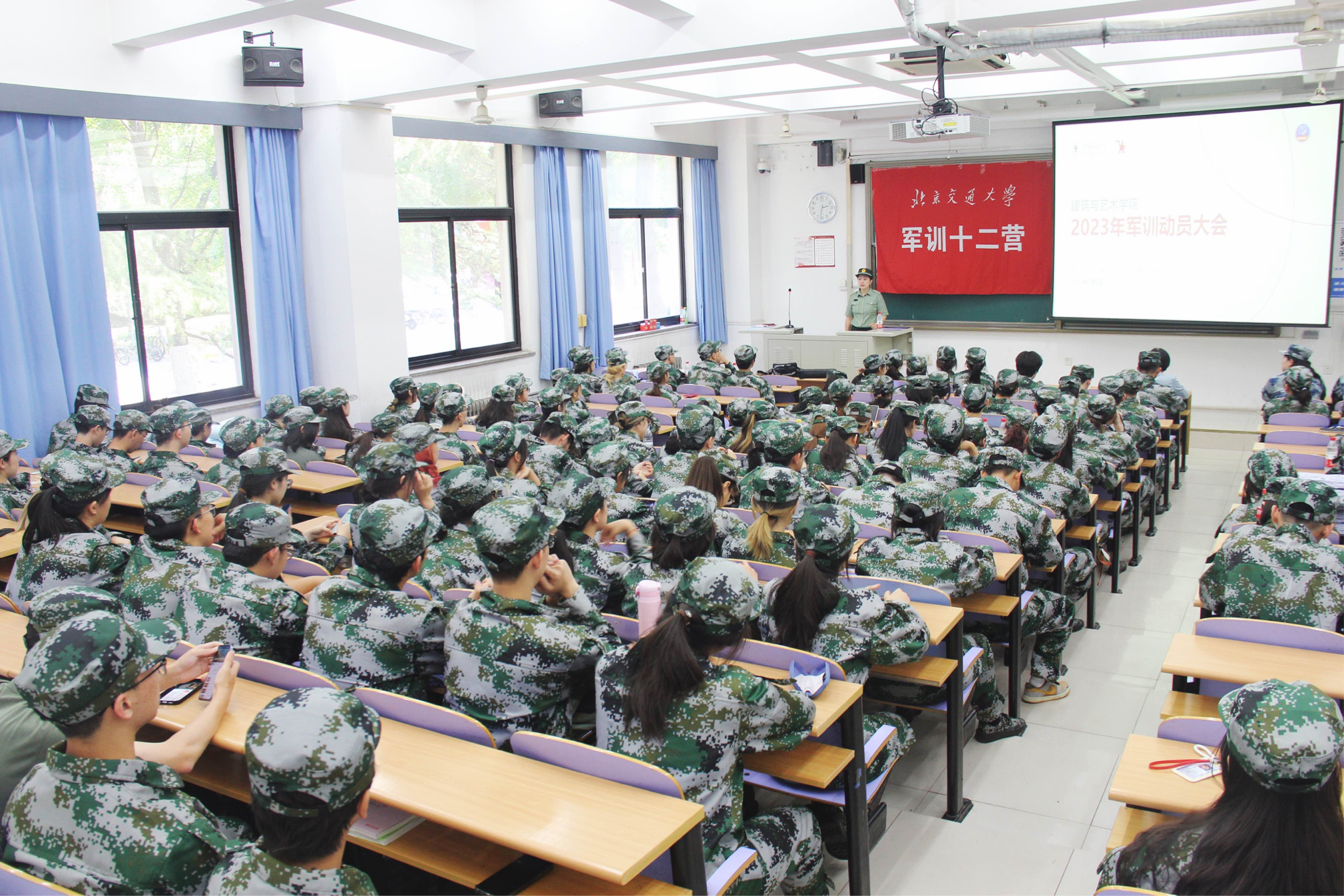 张京介绍了军训课程意义、军训日程时间安排、军训编组分配、军训纪律要求及成绩细则,帮助同学们熟悉军训内容、做好心理准备。她带领全营学生共同喊响十二营口号,凝聚信心,提振士气。