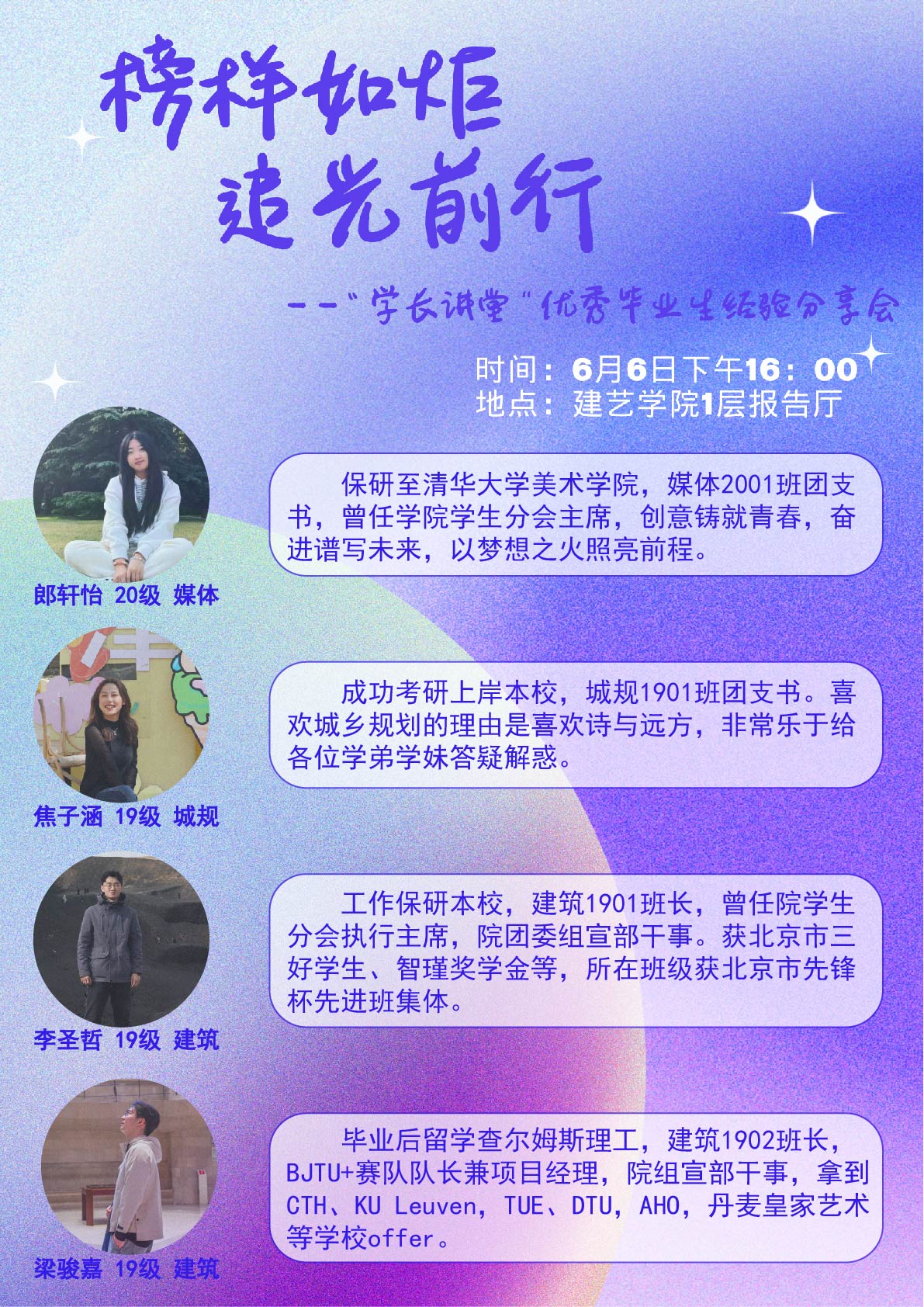 本次榜样宣讲会共有4名优秀的2024届本科毕业生代表为同学们分享经验,内容涵盖专业学习、就业考学、社会工作、科技创新、文体生活等多个方面。城规1901班焦子涵同学分享了自己专业学习和考研备考不甘困苦、砥砺前行的经历,鼓励学弟学妹们不畏艰难、敢于攀登;数媒2001班郎轩怡同学围绕学习保研和夏令营申请,向大家讲述了如何发挥自己的闪光点增强专业优势,鼓励大家在忙碌的学习中保持积极乐观的生活态度;建筑1901班李圣哲同学生动风趣的讲述了自己五年大学时光,主要分享了自己选择做学生干部的体会以及工作保研的经历;建筑1902班梁骏嘉同学从自己参加学科竞赛和留学申请的经历分享经验,鼓励大家勇于创新、敢于尝试。