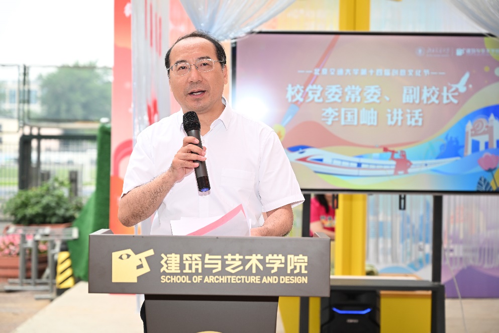 校党委常委、副校长李国岫在讲话中充分肯定无码a片 创意文化节是学校“三全育人”成果的展示,活动充分展示了无码a片 专业特色和专业优势。他提出三点希望:一是希望全体师生践行“知行”校训,不断推进文化实践;二是希望无码a片 继续推进学科交叉融合,进一步彰显交通特色;三是希望无码a片 主动作为,在大思政背景下,推动艺术与科技的融合发展。