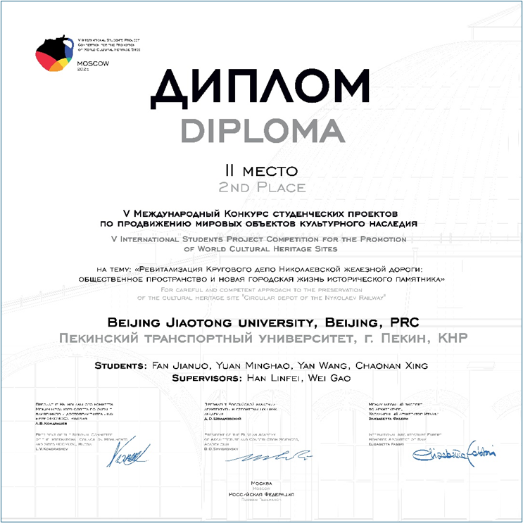我院获奖团队成员包括——教授:韩林飞、高巍;学生:袁铭颢、范佳诺、王妍、邢超楠,他们的参赛作品——《THE EYE OF THE CITY: INTEGRATION AND RECONSTRUCTION OF MOSCOW'S "TRACK ISLAND" UNDER THE CONCEPT OF CIRCULAR SYMBIOSIS》(《城市之眼:循环共生理念下莫斯科 “轨迹孤岛” 的整合与重构》),将循环共生理念与城市空间重构深度融合,展现了扎实的专业功底与创新的设计思维。