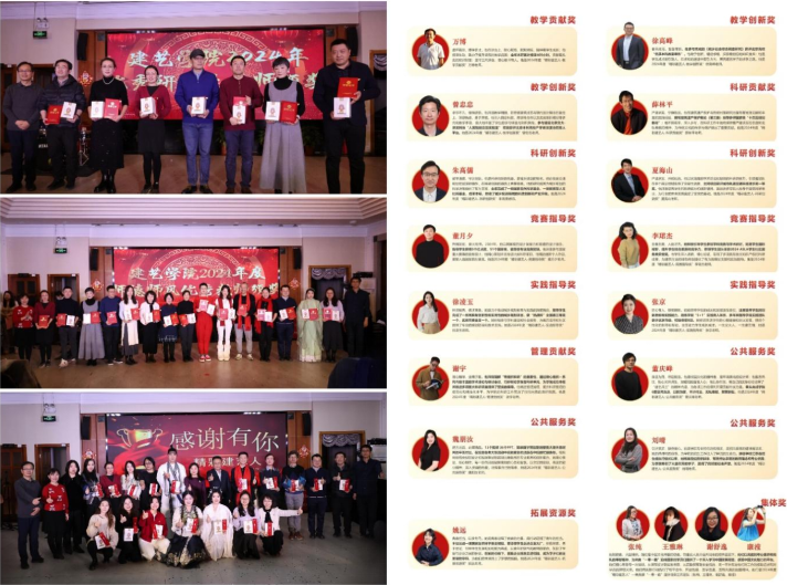 为贯彻全国教育大会精神,进一步加强师德师风建设,鼓励教师落实好立德树人根本任务,学院开展了2024年度“精彩建艺人”“优秀师德师风教师”和“优秀研究生导师”评选表彰。19名教职工分别获得教学贡献奖、教学创新奖、科研贡献奖、科研创新奖、竞赛指导奖、实践指导奖、管理贡献奖、公共服务奖、拓展资源奖等9类“精彩建艺人”荣誉称号,19名教职工获得“优秀师德师风教师”荣誉称号,8名教职工获得“优秀研究生导师”荣誉称号。学院班子成员为获奖教师颁奖。