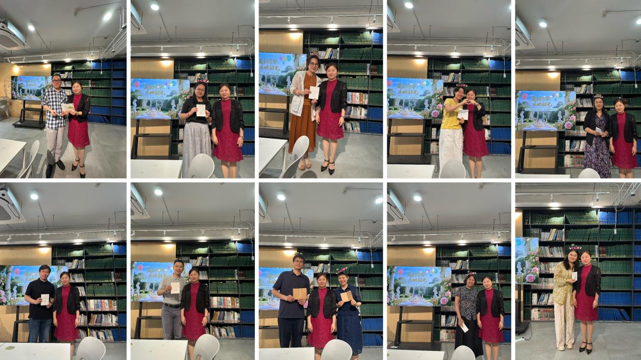 秦思阳为每一位过生日的老师送上精心准备的祝福卡片,卡片上字里行间流淌着对老师们辛勤耕耘、默默奉献的敬意和美好祝愿。老师们接过卡片,脸上洋溢着幸福的笑容,纷纷表示在这温馨的时刻真切地感受到了学院大家庭如春风拂面般的温暖与关怀。随后,在欢快的旋律中,大家齐声合唱《生日快乐》歌。歌声悠扬,回荡在资料室的每一个角落,仿佛将所有的祝福与期许都融入到了这动人的旋律之中。老师们闭上双眼,在摇曳的烛光中许下美好的心愿。